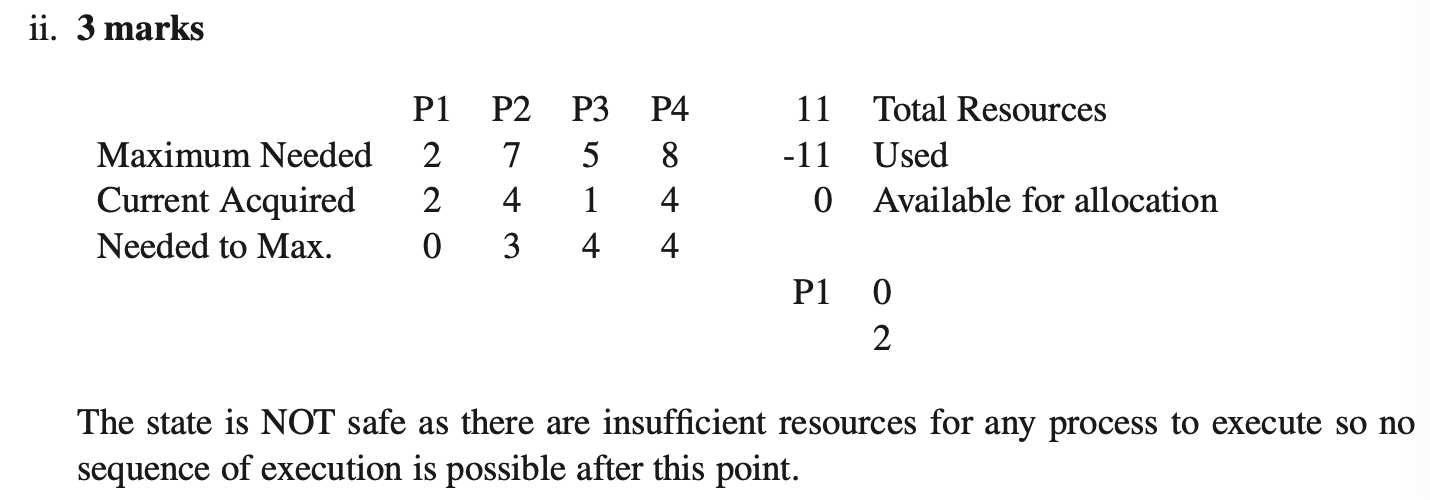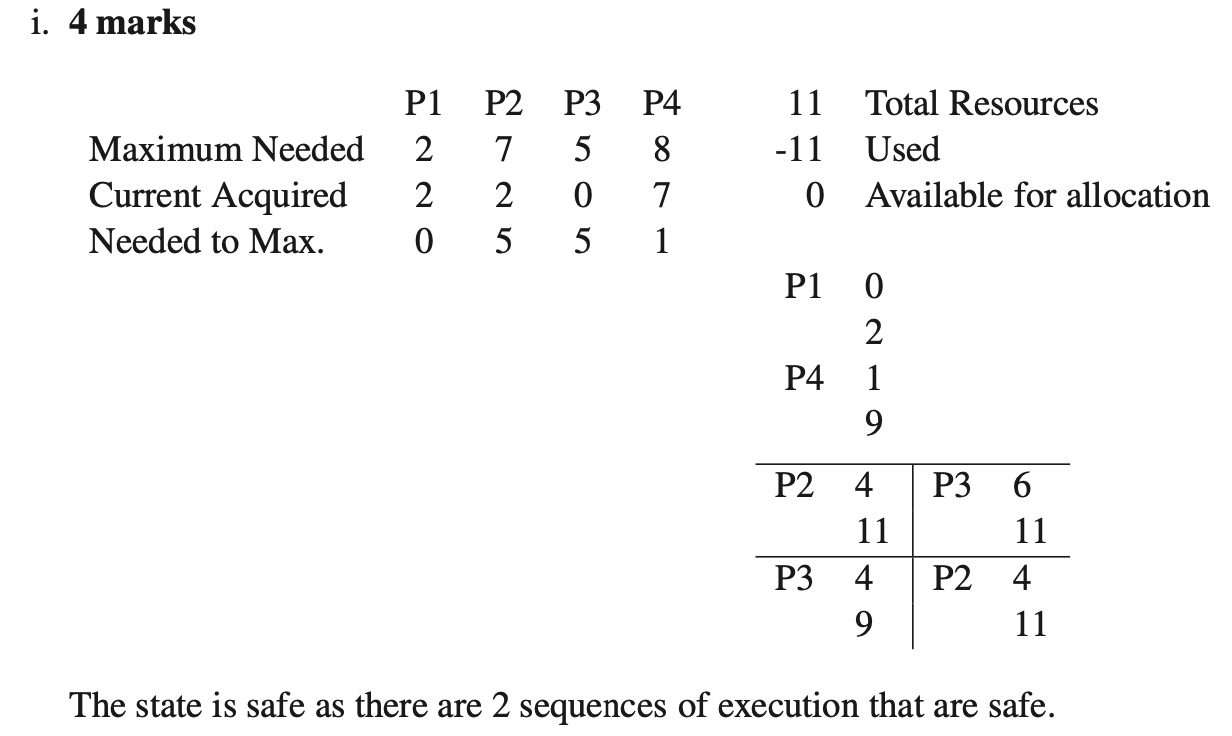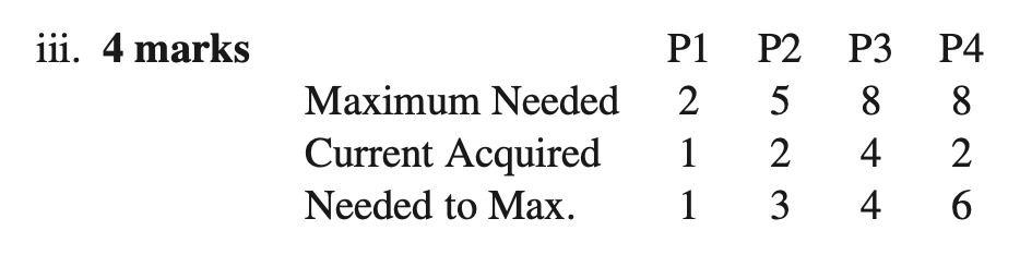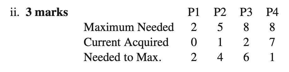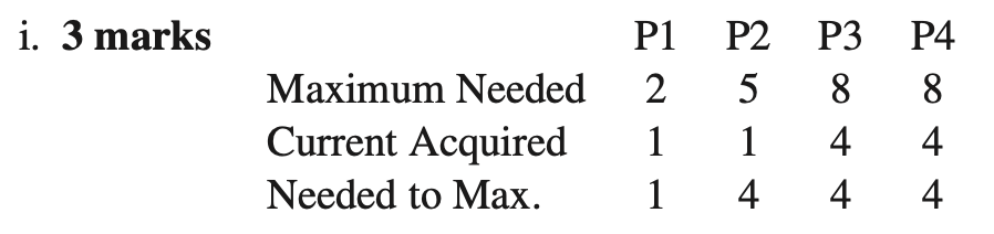 - c) Consider a system in which there is a single resource with 11 identical units. The system uses the banker’s algorithm to avoid deadlock (Deadlock avoidance). Suppose there are four processes with maximum resource requirements of 2, 5, 8, and 8, respectively. A system state is denoted by , where is the number of resource units held by . Which of the following states are safe? Justify your answers with the steps of the banker’s algorithm and a concluding statement.