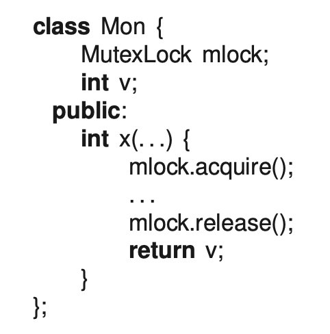 a) The following monitor simulation using a mutex lock has a problem returning