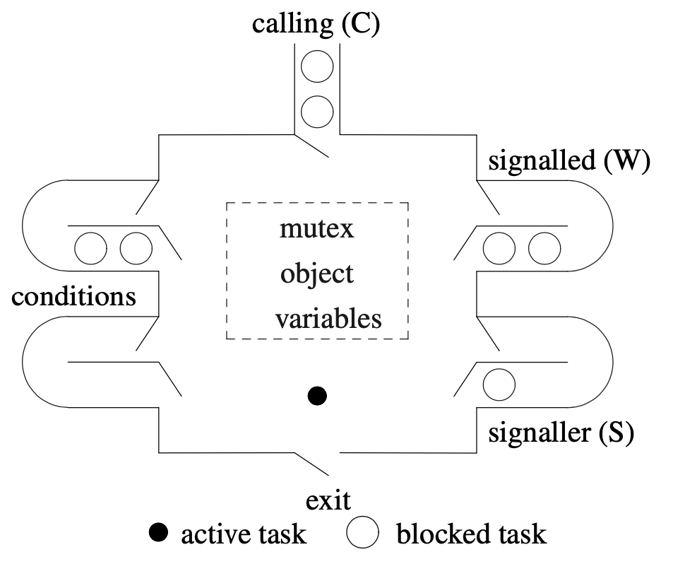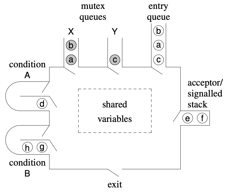 The signalled queue is changed to a stack needed for_Accept. Find the page number that explains this shit (p.159)? Where it says C < W < S or C = W < S. (Found: they also talk about this p.447-448, acceptor/signalled stack LIFO order and to avoid starvation or staleness that the general monitor uses (no temporal ordering))