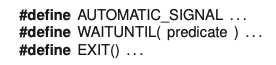 Macro AUTOMATIC_SIGNAL is placed only once in an automatic-signal monitor as a private member, and contains any private variables needed to implement the automatic-signal monitor. Macro WAITUNTIL is used to wait until the predicate evaluates to true. Macro EXIT must be called on return from every public routine of an automatic-signal monitor.