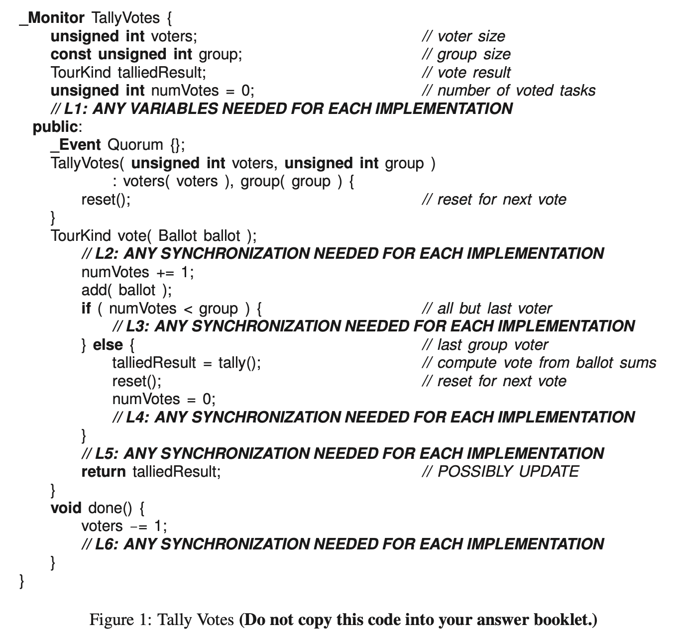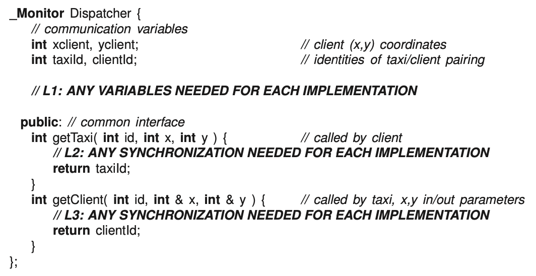 The interface for the dispatcher monitor is the following (you may not change this interface; you may only add code in the designated areas L1, L2 and L3). (Do not copy the starting code into your answer booklet.)