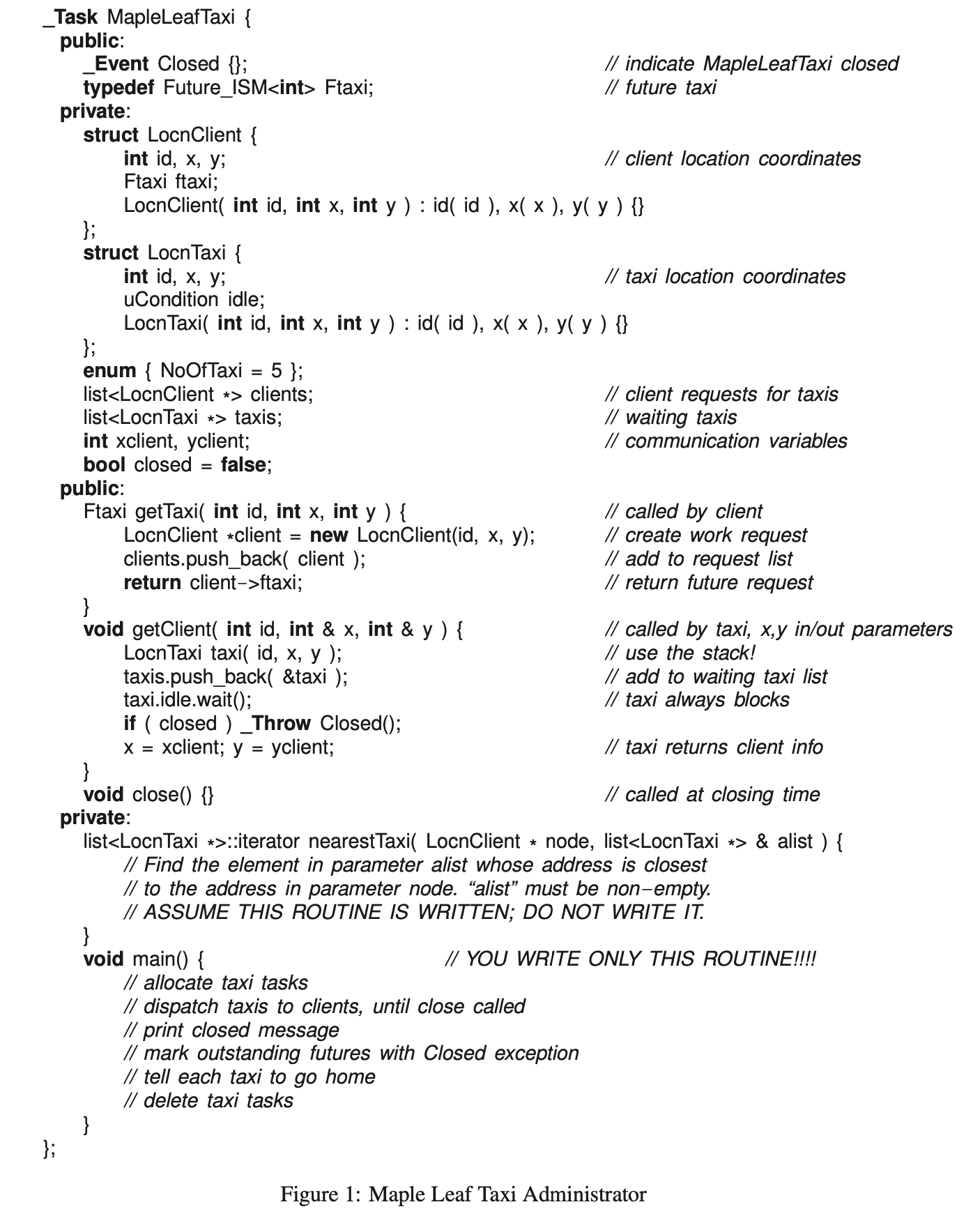 Ensure the dispatcher task does as much administration works as possible; a monitor-style solution will receive little or no marks. Write the code for MapleLeafTaxi::main and any necessary declarations/initializations; do NOT write the client, taxi, or program main. Assume the program main creates and deletes all the necessary tasks, appropriately, and calls the dispatcher’s close routine.