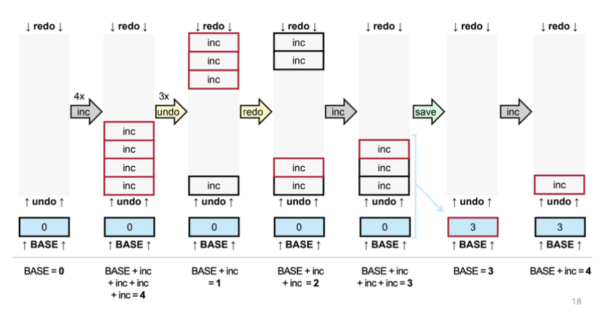 - This approach doesn’t require storing a history of changes; instead, it only stores the reverse operations needed to revert the changes.