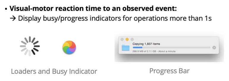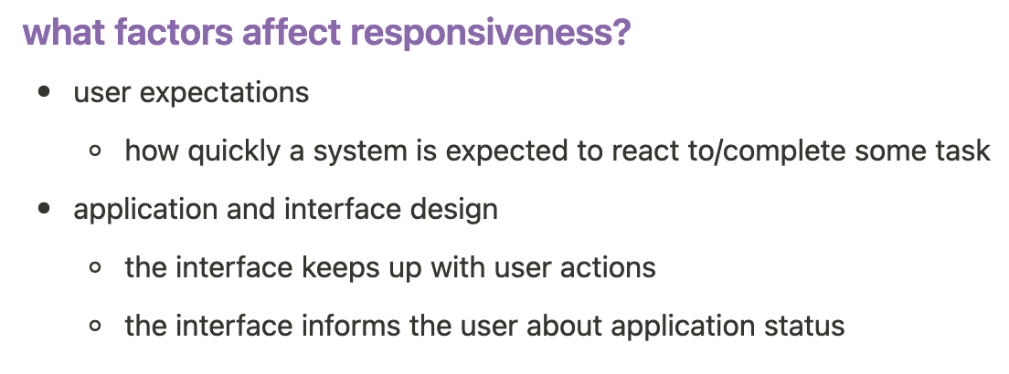 - a system can have slow performance (takes a long time to actually complete the task), but the responsiveness (let the user know their input was received, let them know how long the operation will take, etc.)