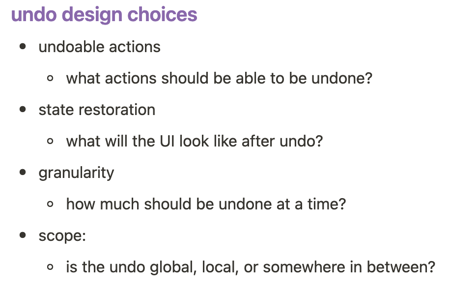 - Consider the asymptotic time (“big Oh”) of executing an undo action after the user has performed N user interface actions. What is it for forward undo? What is it for reverse undo? Assume there is no special caching.
