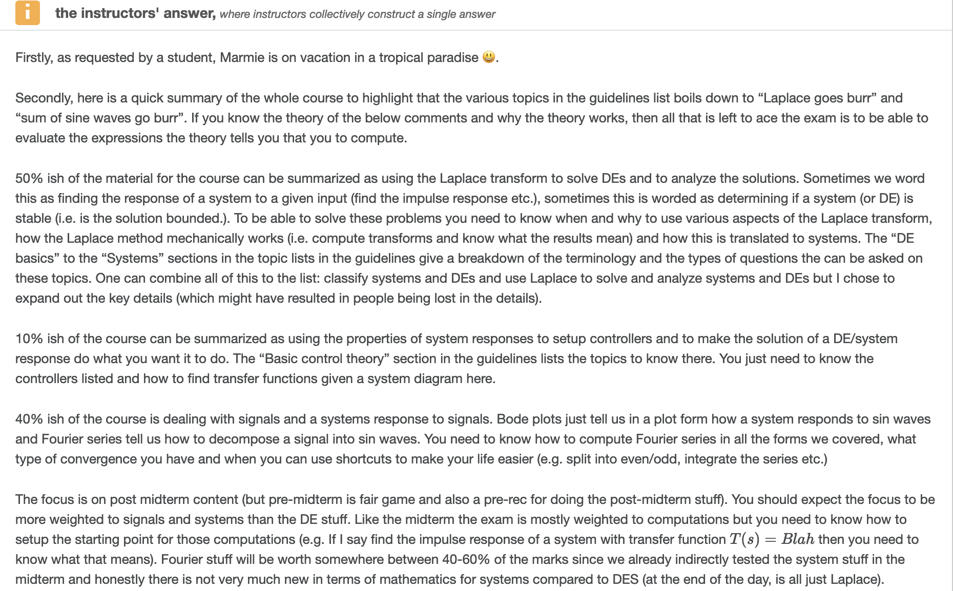 - 50% ish of the material for the course can be summarized as using the Laplace transform to solve DEs and to analyze the solutions. Sometimes we word this as finding the response of a system to a given input (find the impulse response etc.), sometimes this is worded as determining if a system (or DE) is stable (i.e. is the solution bounded.). To be able to solve these problems you need to know when and why to use various aspects of the Laplace transform, how the Laplace method mechanically works (i.e. compute transforms and know what the results mean) and how this is translated to systems. The “DE basics” to the “Systems” sections in the topic lists in the guidelines give a breakdown of the terminology and the types of questions the can be asked on these topics. One can combine all of this to the list: classify systems and DEs and use Laplace to solve and analyze systems and DEs but I chose to expand out the key details (which might have resulted in people being lost in the details).