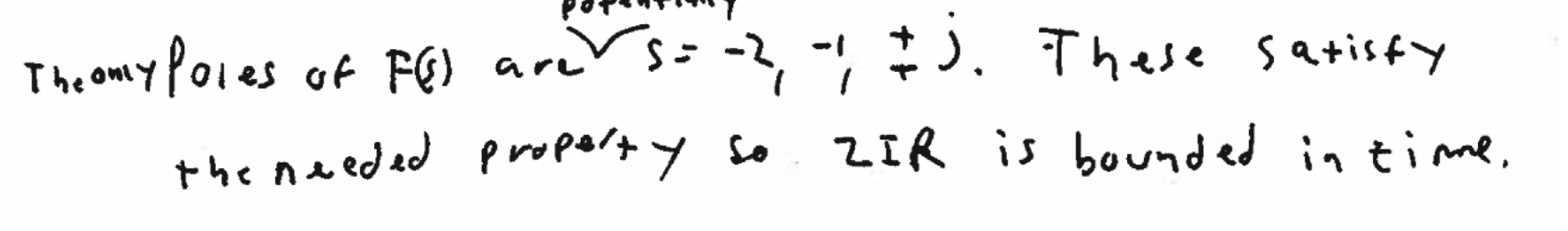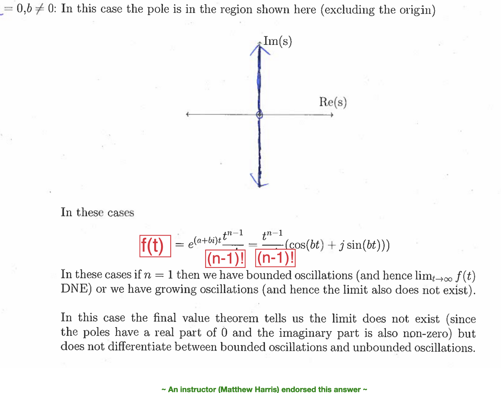 As seen here, having Re(s) = 0 but Im(s) !=0 we are on the imaginary line. Here, we see that if n is 1, then it would just be cos(bt) + jsin(bt), which is bounded. If that isn’t the case, then we would have a growing t term, and thus it would be unbounded. This isn’t explicitly stated anywhere as a rule (so I’m hesitant to say this determinantly), but I think the professor refers to the phenomenon in a bunch of questions. Please correct me if I’m wrong.