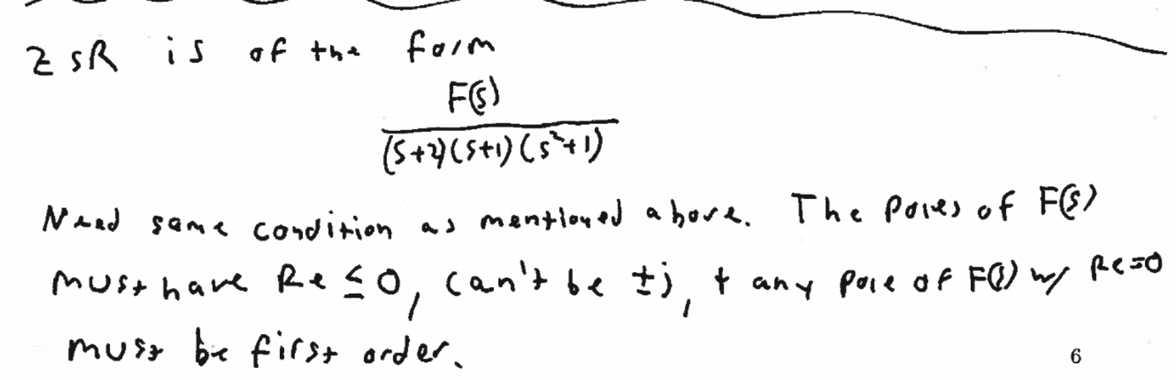 Lecture Example 6, From piazza question: FVT says that all the real parts should be strictly negative or there can be a pole at s=0 (not Re(s) = 0) of order 1. In the first part, the poles at + and - j have Re = 0, so that should give an undefined limit. What property/theorem are you using to be able to say the following for the ZIR: