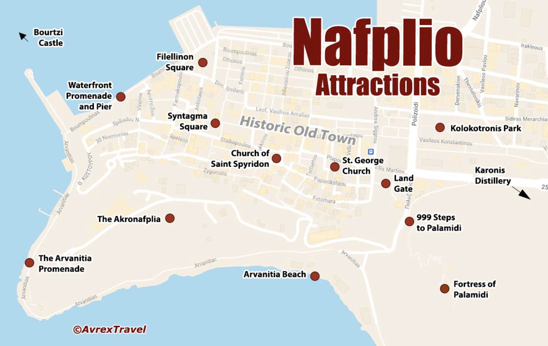 - Enjoy a relaxing walk along the Nafplio Waterfront and the Arvanitia Promenade. The highest point behind the town, Fortress Palamidi, is a product of the Venetian rule, located on the top of a 200-meter-high mountain. Starting from the bottom of the mountain, you can walk up 999 steps or drive to the high entrance.