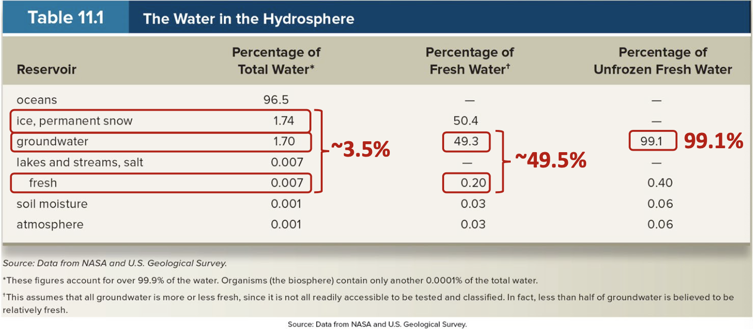 - ~3.5% of total water on Earth is fresh and ~49.5% of that is not frozen!