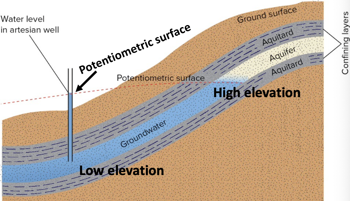 In confined aquifiers, water elevation exerts pressure on water at low elevations