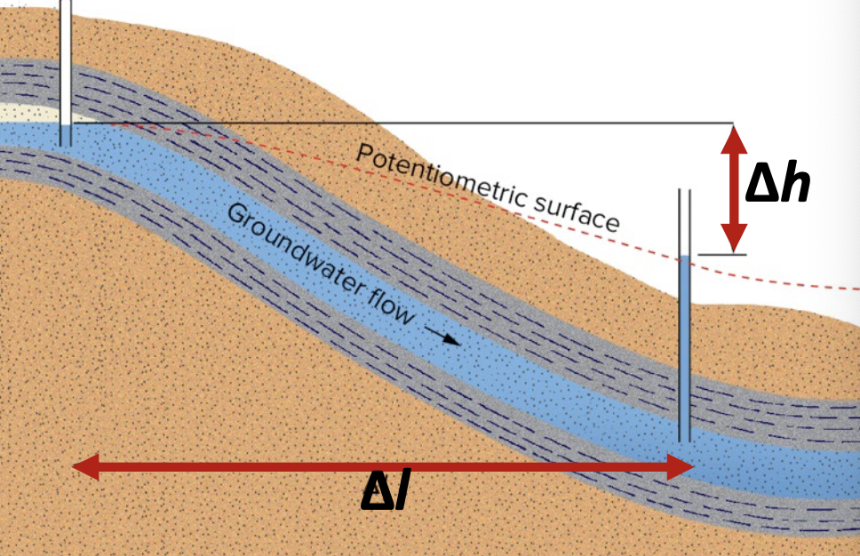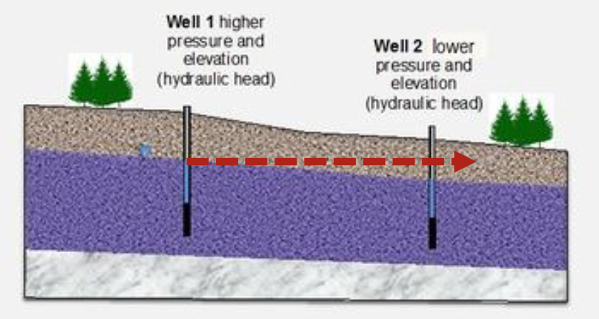 - Height of the water table (unconfined aquifer) and potentiometric surface (confined aquifer) represents the hydraulic head at that point