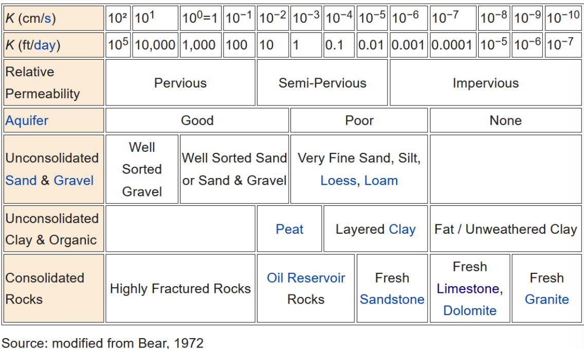 hydraulic conductivity considers permeability of the rock/soil and viscosity and density of fluid