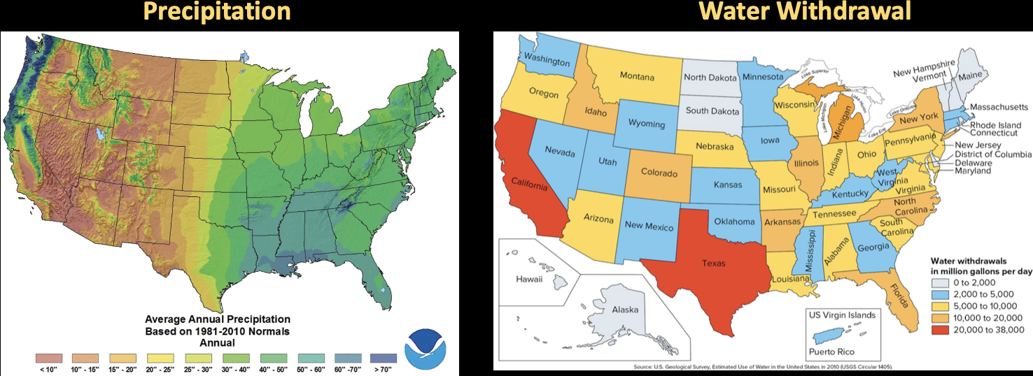 Surface waters dependent on precipitation, which is not evenly distributed and may not correlate with population density and water use.