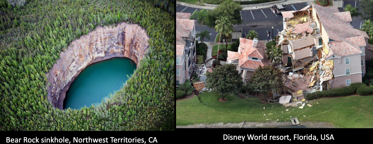 - Triggered by drought or water use that leaves overlying rocks / soil unsupported, or heavy rains transporting soils into caverns