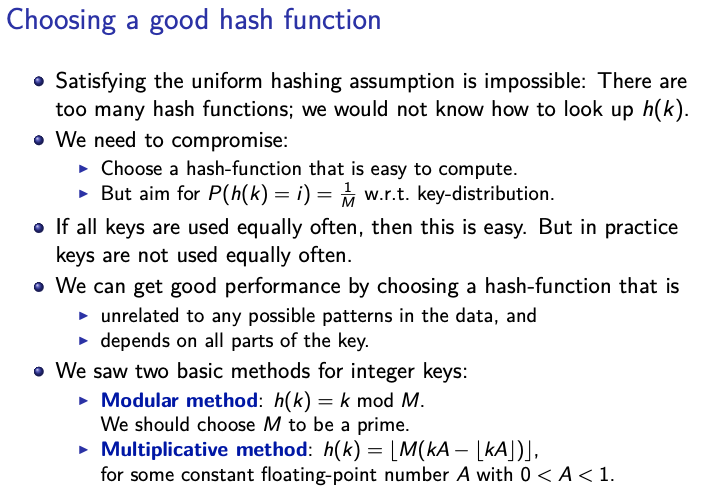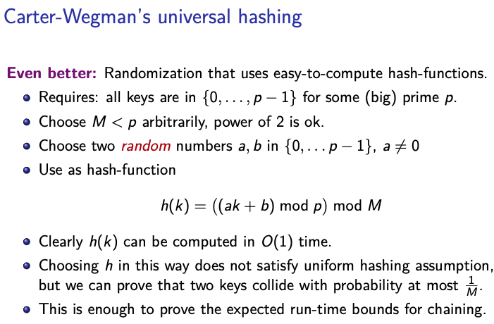 - This means that it uniformly distributes the keys from the universe across all the slots in the hash table of size . In other words, for any key and any slot in the hash table, the probability is . The reason for this property is to achieve “uniform hashing assumption”. It means that each slot is equally likely to be chosen for any given key. This uniformity ensures that the elements are evenly spread throughout the hash table, minimizing the number of collisions. Crucial for achieving average-case time complexity for hash table operations like insertion and search.