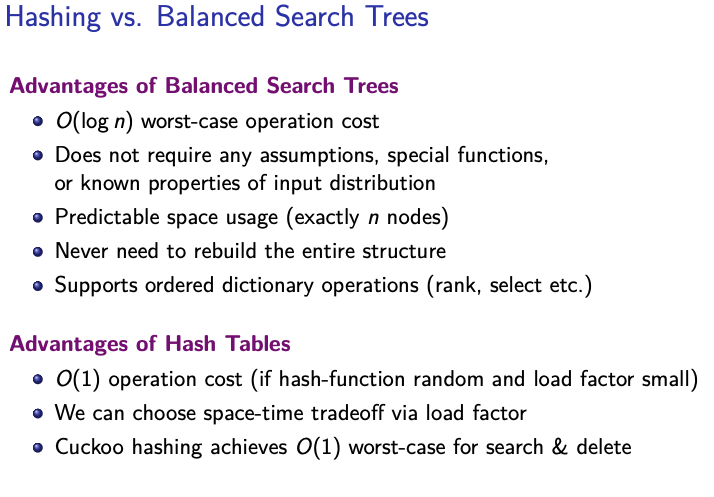 Choose BST if we want guarantee, but Hash Tables cannot guarantee, but is faster usually in the worst-case for search and delete.