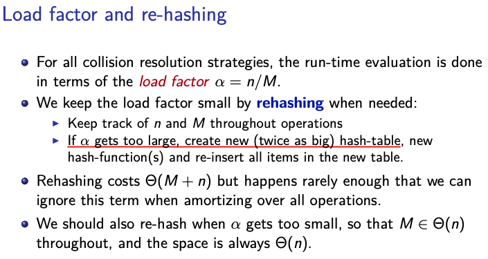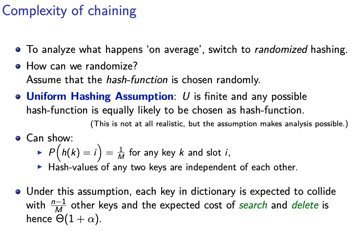 Summary: If we maintain , then (under the uniform hashing assumption) the expected cost for hashing with chaining is , for lookup, insert and delete and the space is .
