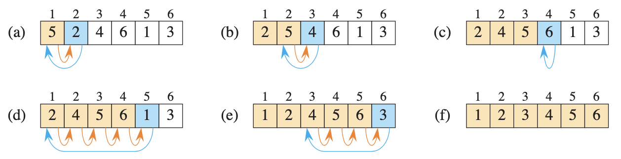 A[j+1] = keyThe pseudocode for insertion sort is given as the procedure INSERTION-SORT. It takes two parameters: an array containing the values to be sorted and the number of values of sort. The values occupy positions through of the array, which we denote by . When the INSERTION- SORT procedure is finished, array contains the original values, but in sorted order.