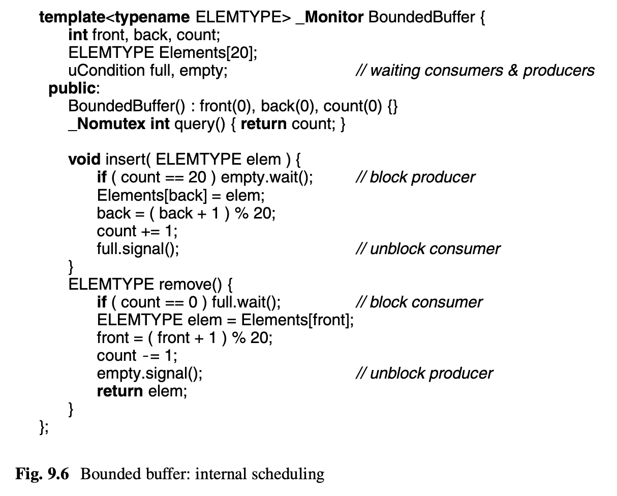 count, because a condition variable has no counter. - If progress cannot be made, i.e., the buffer is full or empty, the task in the monitor explicitly executes a wait to block its execution at this time (like a P), which implicitly unlocks the monitor so another task can enter and change the monitor state.
