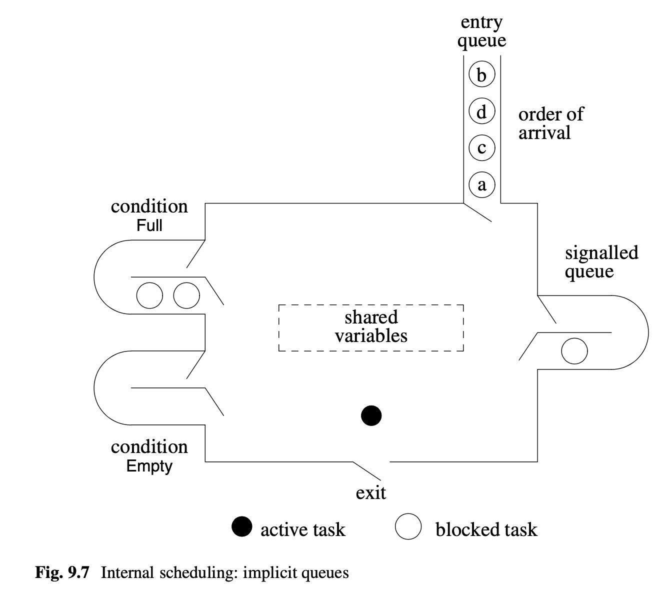 - Finally, the active task in the monitor has signalled one of the tasks from a condition queue.