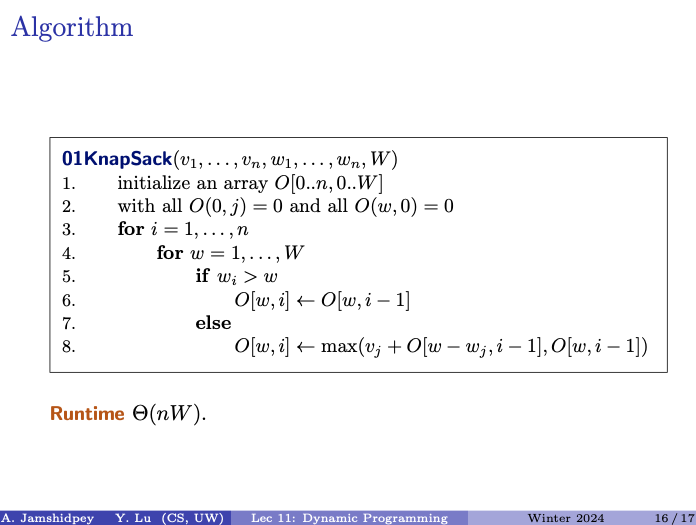 Therefore, the term "" represents the maximum value achievable with the remaining capacity considering only the first items, which is why it’s and not . We exclude item from consideration after choosing it for the knapsack.