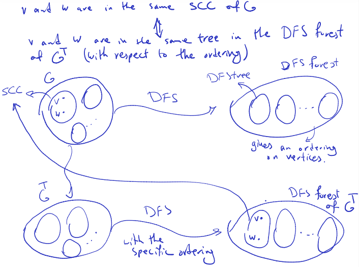 - and are in the same tree in the DFS forest of (with vertices ordered in decreasing finish time)