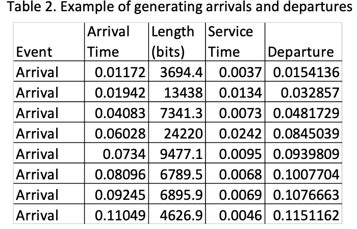 - Packet departure: Calculate the departure time of a packet based on the state of the queue, i.e., whether the queue has packets or it is idle. If the queue has packets, then the departure time of a packet pk will be the departure time of the previous packet pk plus the service time of pk. Note that the service time depends on the length of the packet, L, and the transmission rate, C, of the server. If the queue is idle, then the departure time of packet pk will be its arrival time plus its service time. See Table 2.