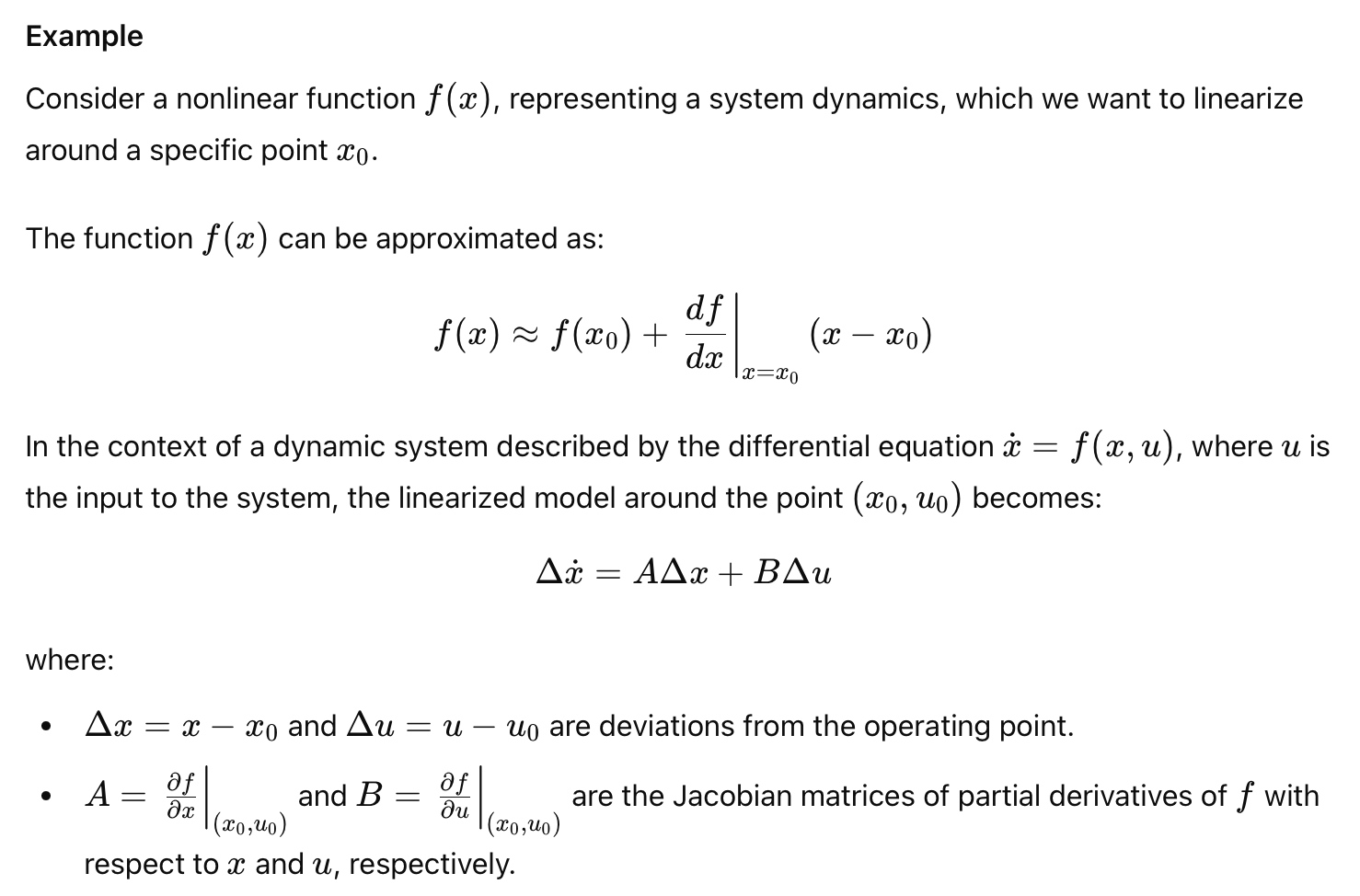 The process of linearization involves taking the Taylor series expansion of the nonlinear system’s equations around a point of interest (usually an equilibrium point) and keeping only the first-order terms. The higher-order terms are discarded, assuming that their contribution to the system’s behaviour is small near the operating point.