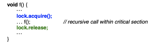- single acquisition cannot handle looping or recursion involving the same lock, e,g,: