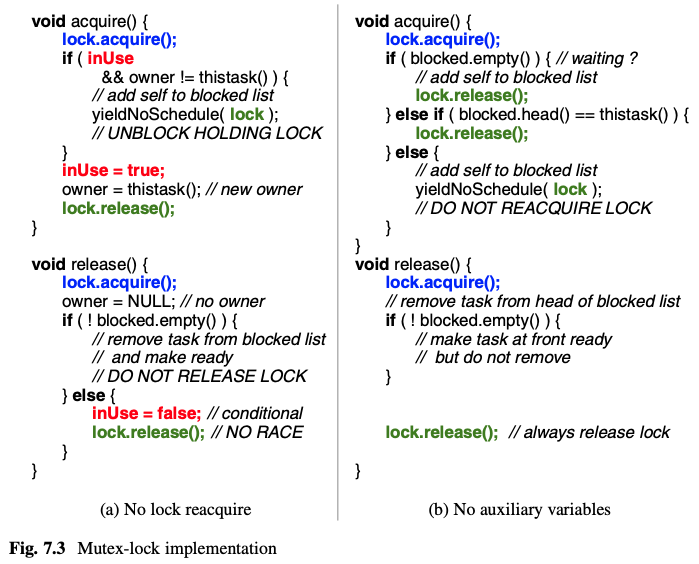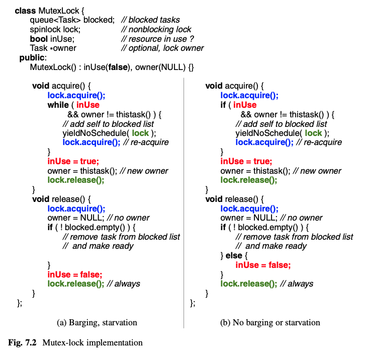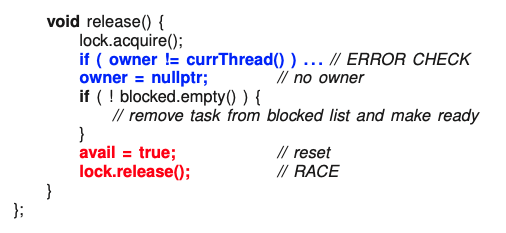 - After the releasing task acquires the spin lock and decides to unblock a task, it does not release the spin lock (baton passing, see Sect. 7.6.1, p. 356), which is accomplished by moving the spin-lock release into the else clause in member release.