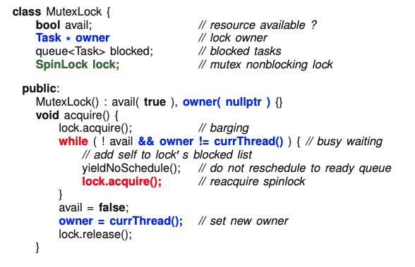 - When the blocked task restarts in member acquire, the spin- lock acquire after the yield is removed because the spin lock has not been released, so the unblocked task can safely perform any additional operations needing mutual exclusion.