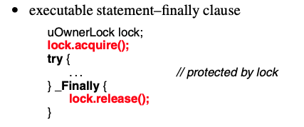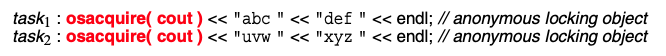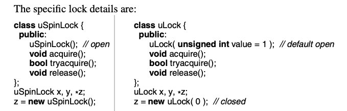 - b) two tasks are created in uMain::main and each is passed a reference to an instance of uLock. Each task uses the lock to provide mutual exclusion for two critical sections in their main routine by acquiring and releasing the lock before and after the critical section code. When one task’s thread is in a critical section, the other task’s thread can execute outside the critical sections but must wait to gain entry to the critical section.