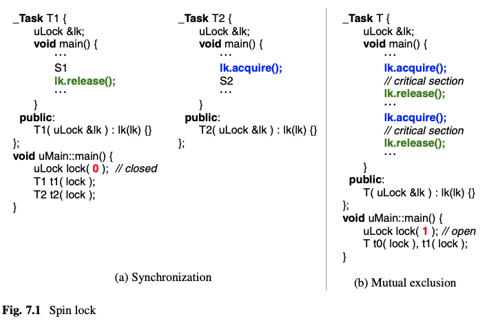 - a) two tasks are created in uMain::main and each is passed a reference to an instance of uLock. As in previous synchronization examples, the lock starts closed instead of open so if task t2 reaches S2 first, it waits until the lock is released by task t1. As well, the synchronization protocol is separated between the tasks instead of surrounding a critical section.