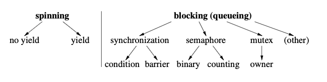 Spinning locks busy wait until an event occurs task oscillates between ready and running states due to time slicing.