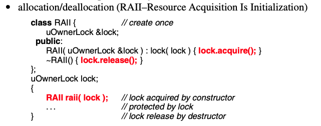 - The RAII class has a reference to a mutex lock and its constructor acquires the lock and its destructor releases the lock.