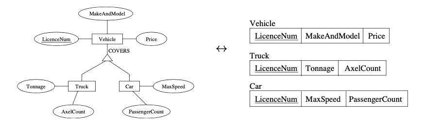 - contains a reference to Vehicle’s primary key as a foreign key in both Truck and Car tables.