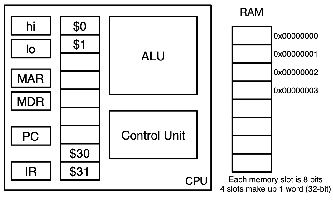 Off-chip memory (RAM): The components discussed above are all physically part of our sim- plified MIPS processor. As you have likely noticed, the processor has access to very limited on-chip memory (in the form of registers). Since registers are physically on the processor, they are incredibly fast, but physical space on the processor comes at a premium. Since programs have bigger memory needs, a real-life processor must therefore also communicate with external memory modules that can hold more data but are slower to access. These include L1/L2 cache, RAM, hard drives, etc. Our simplified processor only communicates with the RAM (shown separately in the diagram above). We will view the RAM as an array of 8-bit (1 byte) slots with addresses starting from 0 at the top and increasing as we go down the array. Since our processor is 32-bits, 4 RAM addresses comprise a single word. We will use hexadecimal representation for memory addresses.