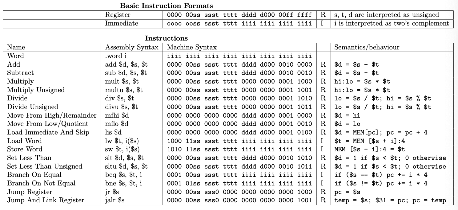 General Purpose Registers: Our MIPS processor has 32 so-called “general purpose registers” (labelled 31 in the diagram). Each register holds 32 bits. While these registers are la- beled for general use, we will use some of them to hold specific values at all times, and some of them have special uses dictated by MIPS. In particular, 0 are ignored by MIPS CPUs), 30 as the stack pointer and $31 will store the return address. The need for these will be discussed later.