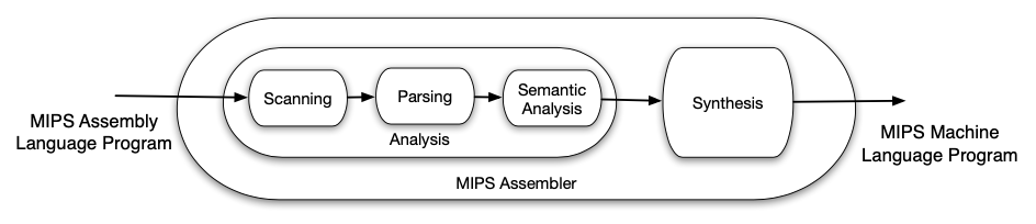 An assembler must make sense of each line in the assembly language program and determine that there are no syntax errors or violations of Assembly Language rules. This is the Analysis stage. Once the assembler has determined that the input is a legal program, the Synthesis stage generates the output, the equivalent MIPS Machine Language program.