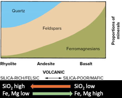 - Felsic magma – high in SiO2 (up to 75 %) with some aluminum, but low in iron and magnesium. High viscosity, flow slowly. Gases get trapped, cause explosions.