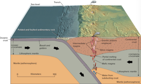 - But can mix with sediments while subducting plate or interact with overlying crust while traveling back to surface ⇒ more felsic