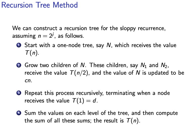 - The recursion tree method finds the solution of the exact recurrence when (it is in fact a proof for these values of ).