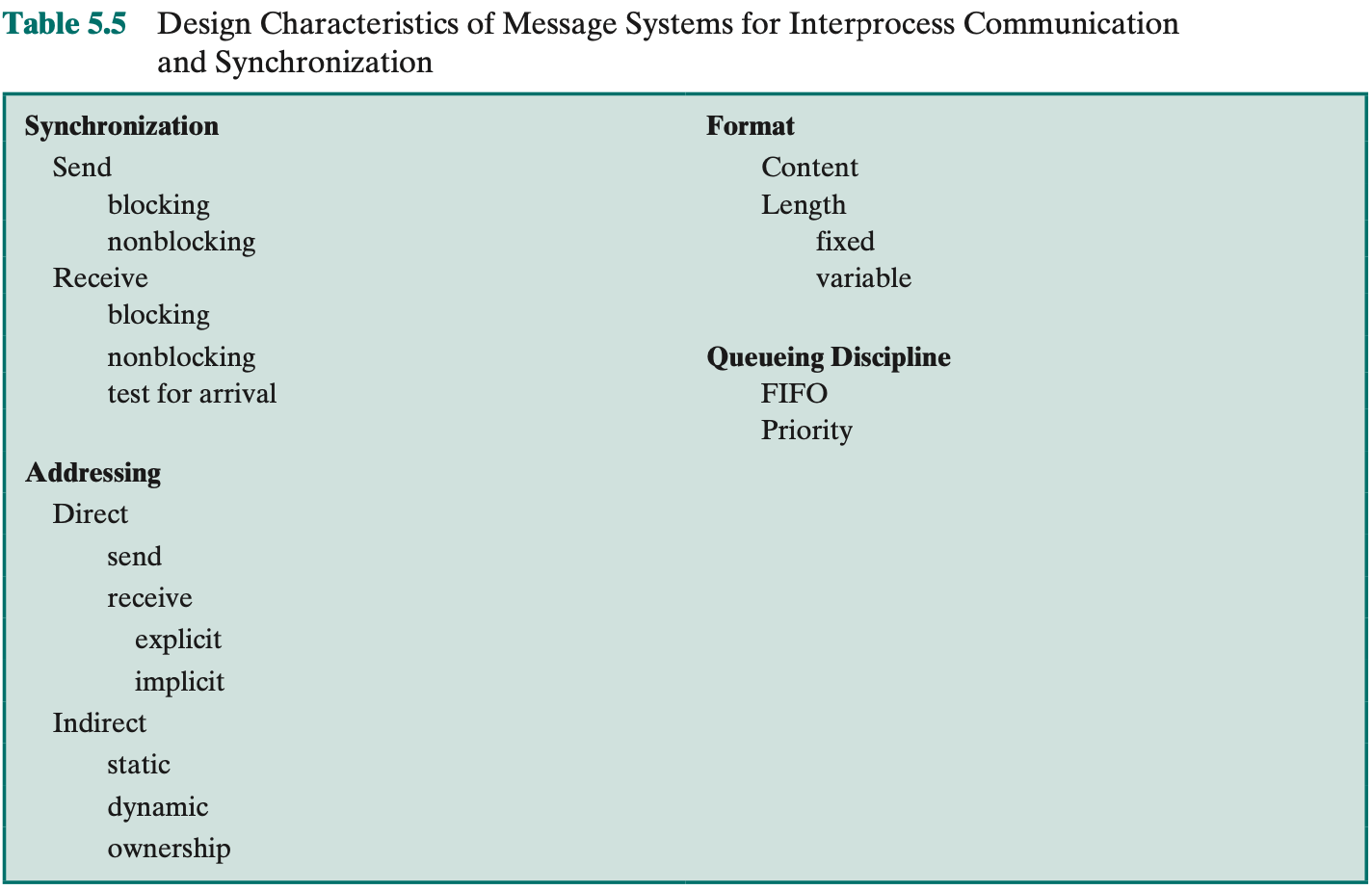 - Nonblocking send, nonblocking receive: Neither party is required to wait.