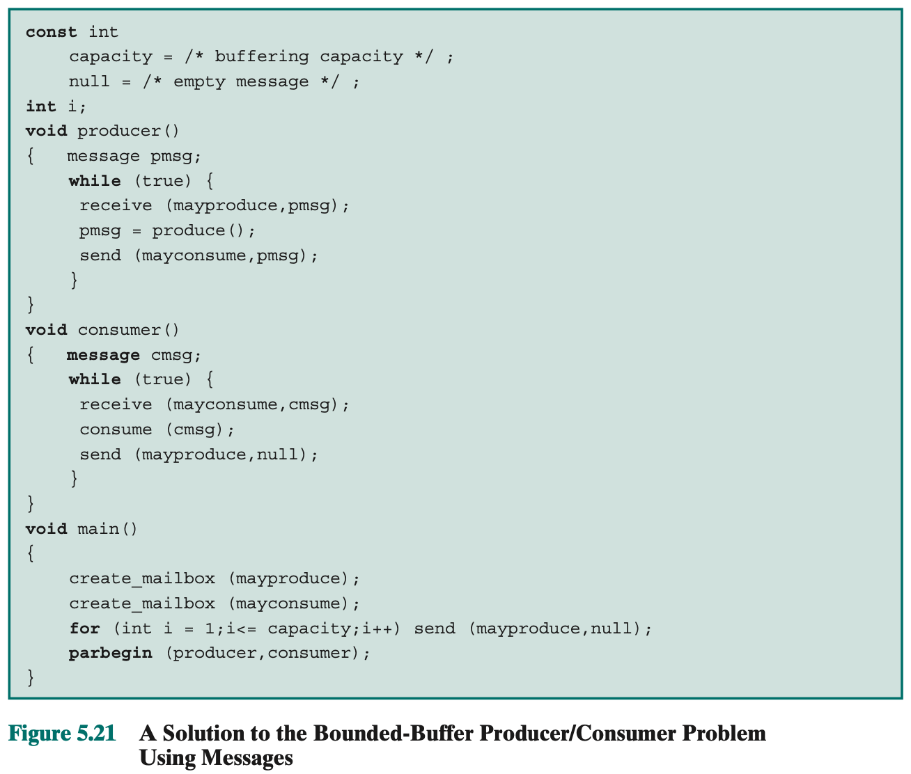 As the producer generates data, it is sent as messages to the mailbox . As long as there is at least one message in that mailbox, the consumer can consume. Hence serves as the buffer; the data in the buffer are organized as a queue of messages. The “size” of the buffer is determined by the global variable capacity. Initially, the mailbox is filled with a number of null messages equal to the capacity of the buffer. The number of messages in shrinks with each production and grows with each consumption.