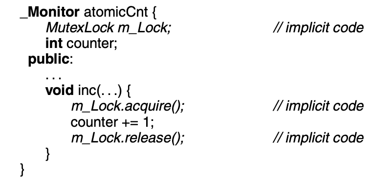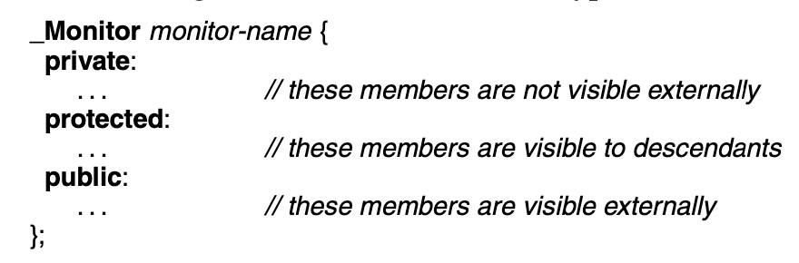 In C++, a monitor is an object with mutual exclusion defined by a monitor type that has all the properties of a class. The general form of the monitor type is the following: