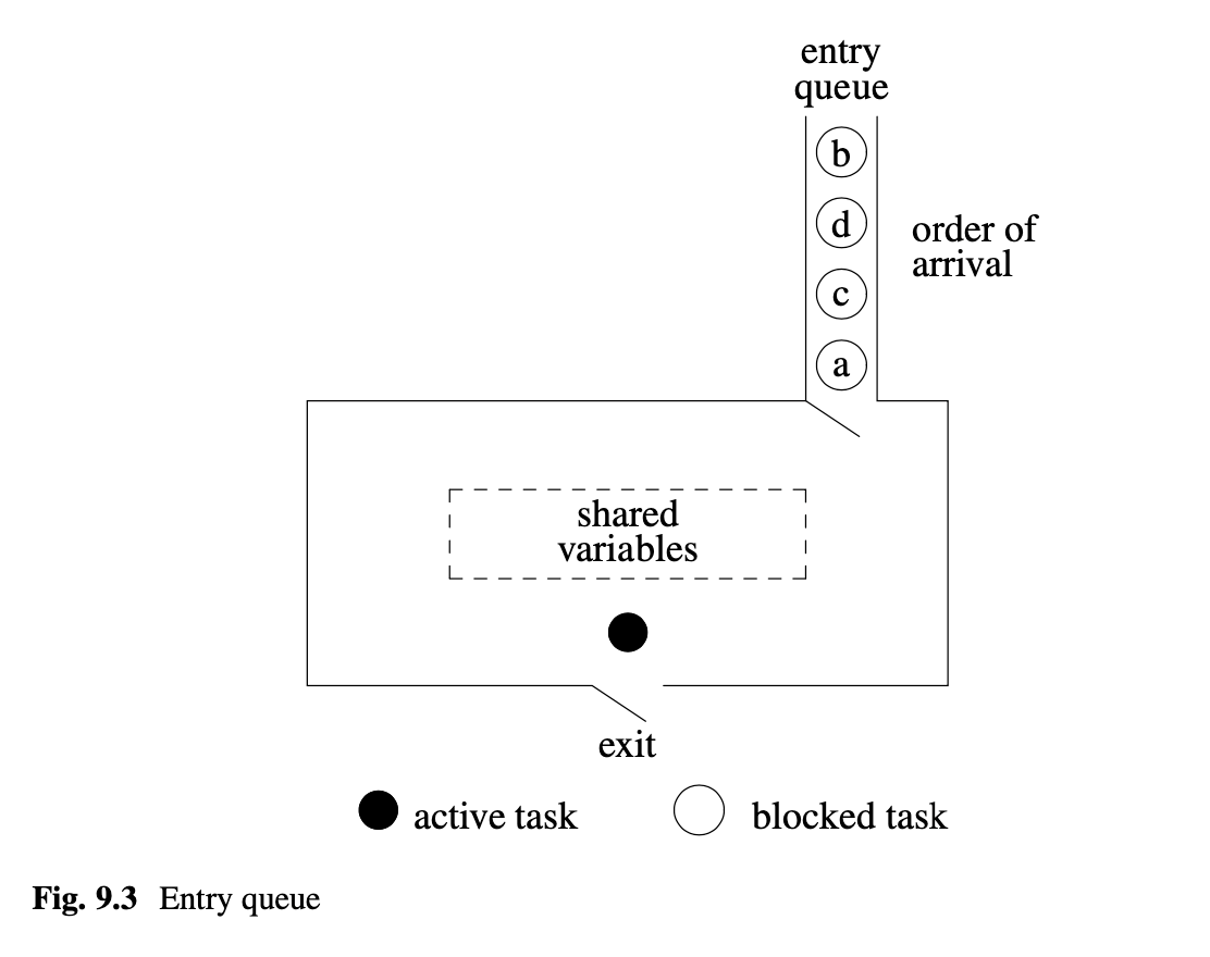 In C++, arriving tasks wait to enter the monitor on the entry queue, and this queue is maintained in order of arrival of tasks to the monitor (see top of Fig. 9.3).