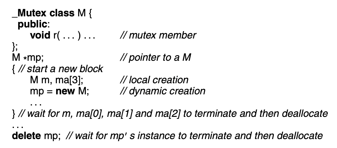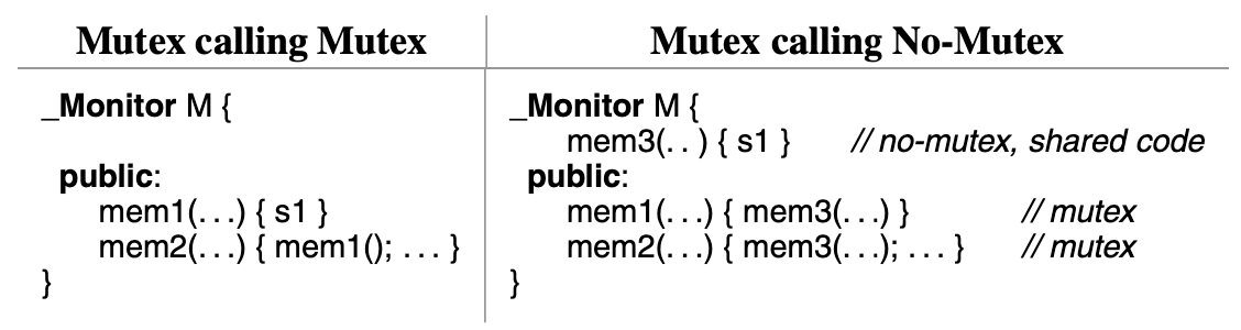 This capability allows a task to call into the mutex member of one monitor, and from that mutex member call into the mutex member of another monitor, and then call back to a mutex member of the first monitor, i.e., form a cycle of calls among mutex members of different monitors. Therefore, in C++, once a task acquires a monitor, there is no restriction on the use of the monitor’s functionality.