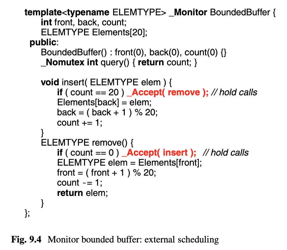 External scheduling schedules tasks outside the monitor and is accomplished with the accept statement.