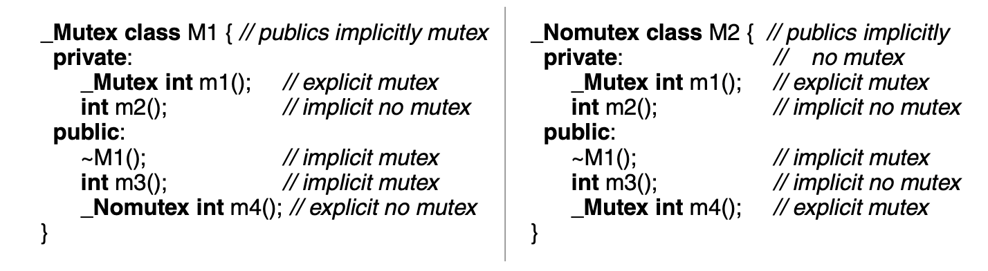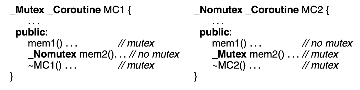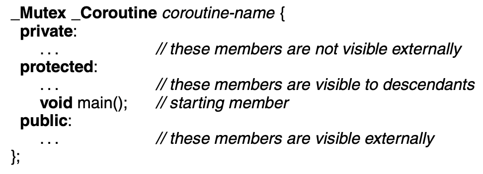 A _Coroutine creates a coroutine-monitor if and only if it has at least one _Mutex member routine, and that _Mutex member routine can have any visibility, i.e., private, protected or public